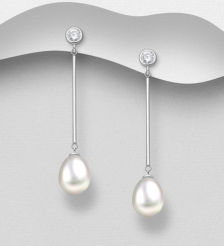 Silver Studs Earrings, Decorated with Freshwater Pearls and CZ